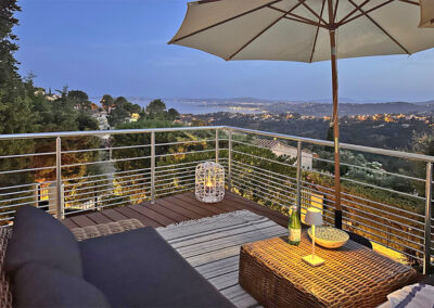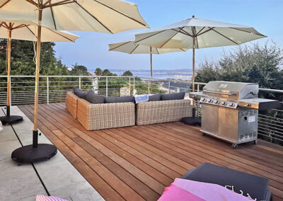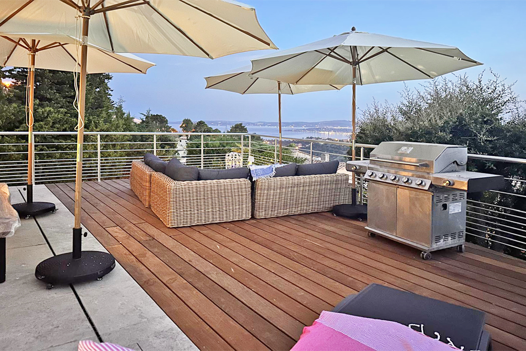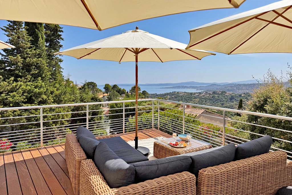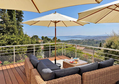 In front of the living area is the spacious teak terrace, which offers a very nice sea view towards Sainte-Maxime and St. Tropez. This is equipped with attractive garden furniture such as a large dining ensemble, a beautiful lounge seating area, several sun loungers, parasols, a daybed and a gas BBQ.