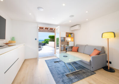 – espace de vie avec vue sur la mer et kitchenette intégrée de haute qualité avec plaque en céramique incluant extracteur, four, lave-vaisselle, machine à laver, micro-ondes, réfrigérateur/congélateur, grille-pain, bouilloire et machine à café