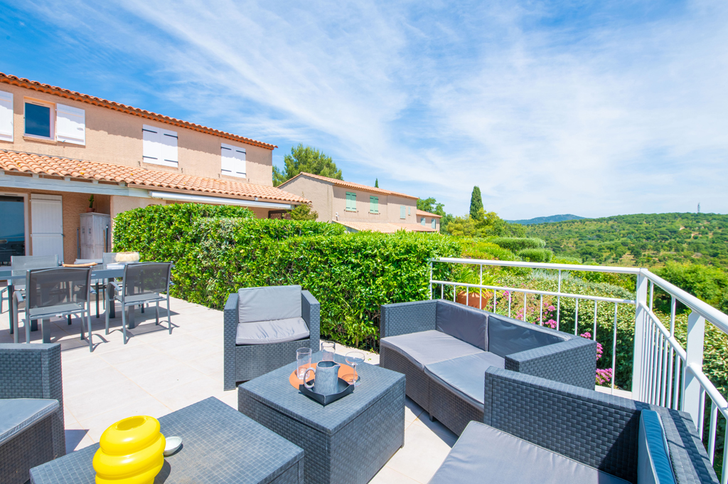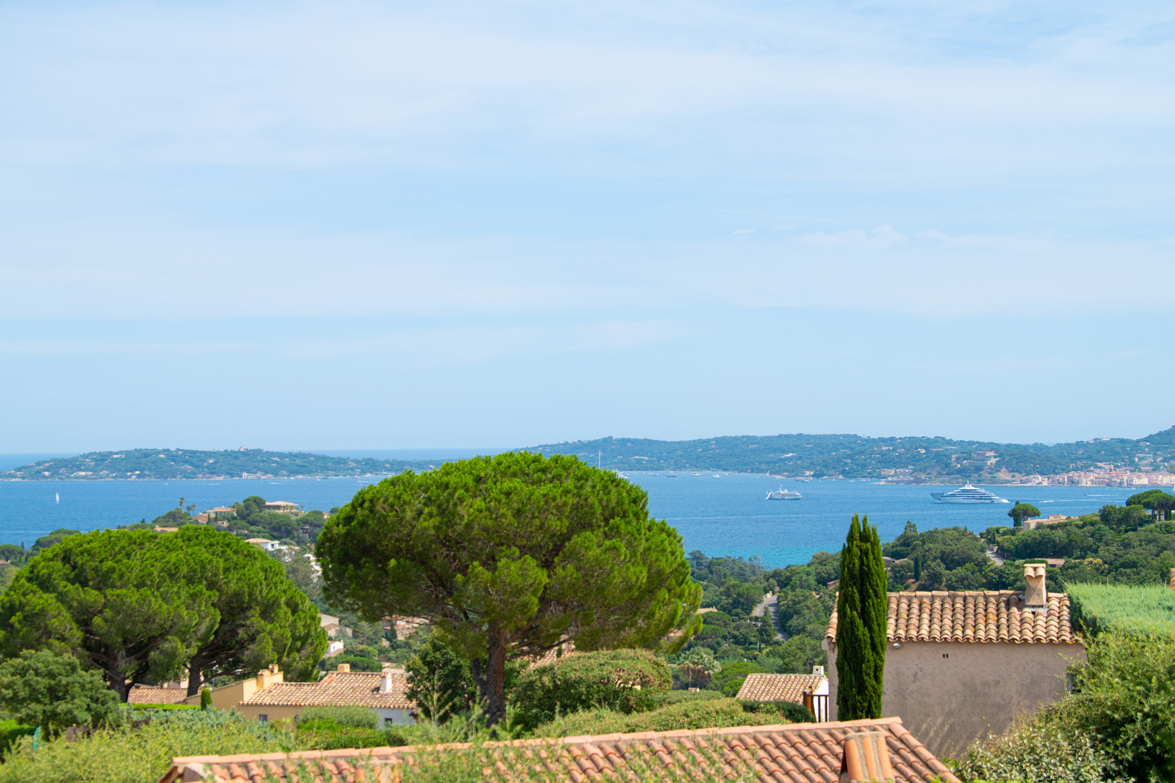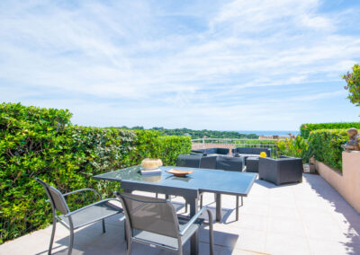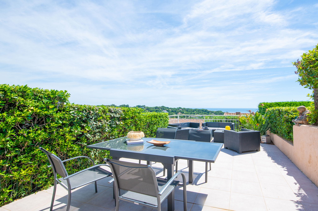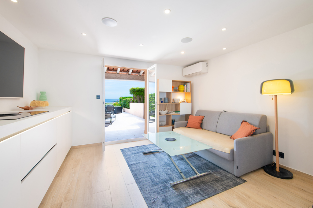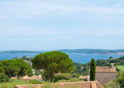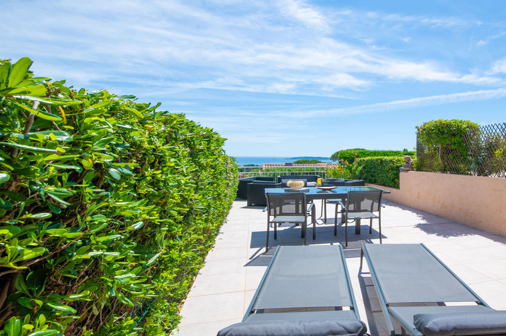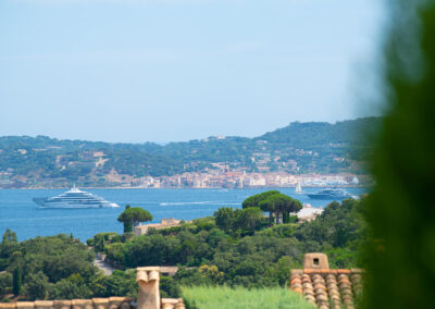 L’espace extérieur comprend une terrasse privée d’environ 50 m² avec une très belle vue sur la mer sur la baie de Saint-Tropez, un salon et deux transats.