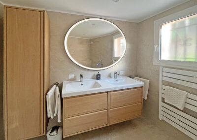 Die Wohnfläche für bis zu acht Personen ist aufgeteilt in einen großzügigen Wohn-/Essbereich mit angrenzender sehr moderner Küche, einer Mezzanine mit Schreibtisch/Büro, drei Schlafzimmer sowie einem weiteren Schlafzimmer auf einer unteren Ebene. Ingesamt stehen zudem drei Bäder und drei WCs zur Verfügung. Drei Schlafzimmer sind mit Doppelbetten ausgestattet, ein Schlafzimmer mit zwei Einzelbetten (2 x 90 x 200 cm).
